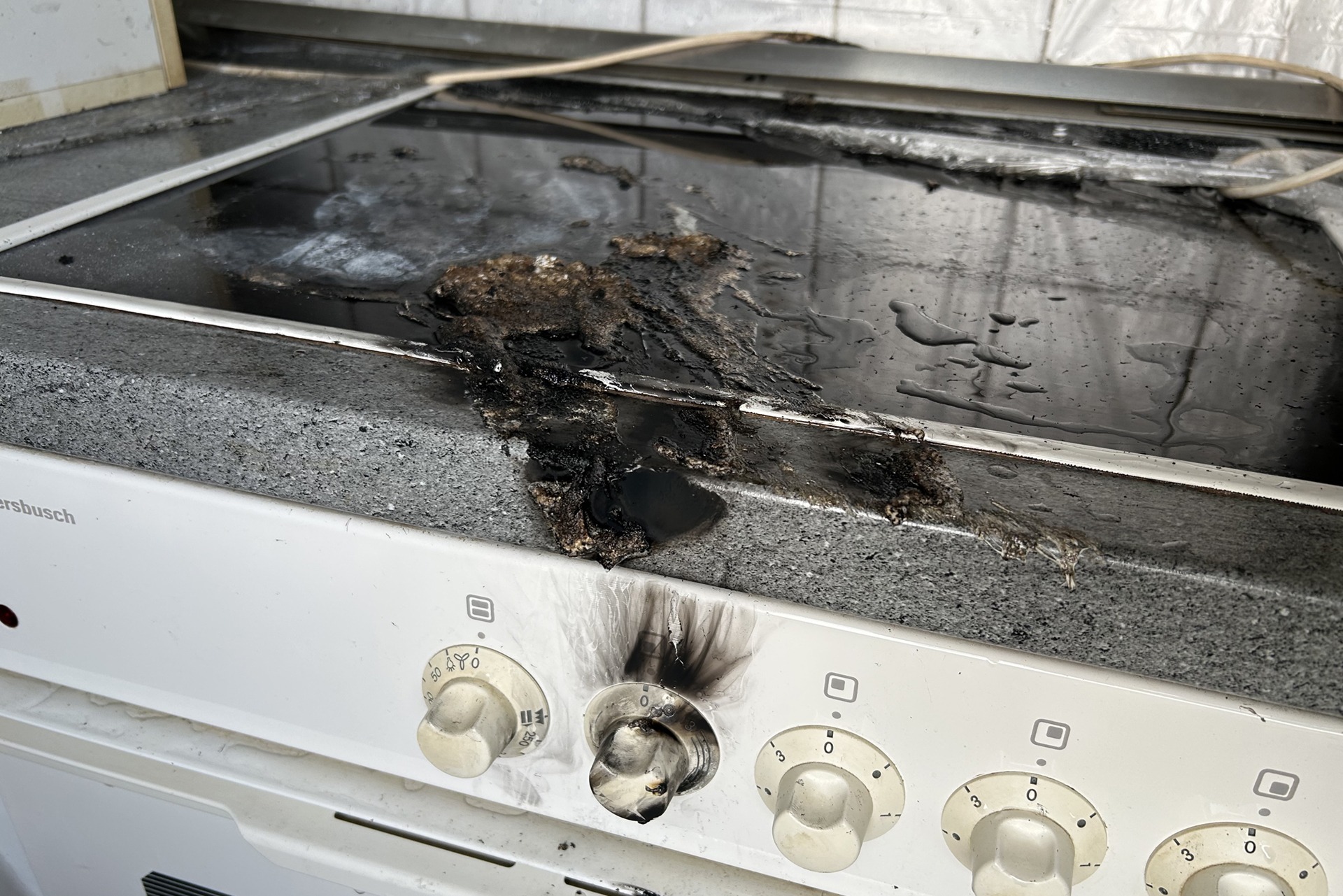 Vor Ort standen dann die Mieter der Wohnung bereits auf der Straße. Sie gaben an, der Brand sei bereits gelöscht und die Wohnung sowie das Treppenhaus verraucht. Der Angriffstrupp hat dann unter Atemschutz das Treppenhaus und die Wohnung begangen. Grund für den Brand war ein Kunststoffregal, was auf dem Herd abgelegt wurde – während die Wohnung renoviert wurde- der Herd wurde aus versehen eingeschaltet und das Regal begann zu brennen. Es wurde durch die Wohnungsmieter selbst gelöscht. Treppenhaus und die Wohnung wurden durch die Feuerwehr natürlich belüftet.
